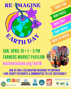 We are joining nonprofit partners for Eugene's Re-Imagine Earth Day! Join us for a day to engage, learn, and take meaningful steps towards a healthier planet. Re-Imagine Earth Day is hosted by Waste Wise Lane County, BRING Recycling, MECCA, and City of Eugene Waste Management.